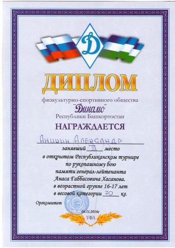 В городе Уфе, на осенних каникулах, состоялся открытый Республиканский турнир по рукопашному бою памяти генерал-лейтенанта Анаса Габбасовича Хасанова. А.Г.Хасанов - государственный деятель, генерал-лейтенант внутренней службы, заслуженный работник Министерства внутренних дел, заслуженный юрист Республики Башкортостан. В турнире приняли участие 150 спортсменов - лучших «рукопашников» республики. Соревнование проводится по олимпийской системе. Цель турнира - воспитание молодежи в духе патриотизма, популяризация Динамовского движения, в целом, и рукопашного боя как служебно-прикладного вида спорта в Республике Башкортостан. В обществе сильнейших город Октябрьский представляли трое обучающихся клуба единоборств «Лига -11», действующем на базе Дворца детского и юношеского творчества. Ребята показали себя достойными борцами, продемонстрировали лучшие свои качества, стремление к победе и упорство. На пьедестал почета, по результатам выступления поднялся Аникин Александр. Александр в весовой категории 70 кг занял 3 место. Копилка достижений клуба единоборств «Лига-11» пополнилась еще одной победой. Поздравляем Александра и ребят участников, желаем им в дальнейшем успешных выступлений. | |