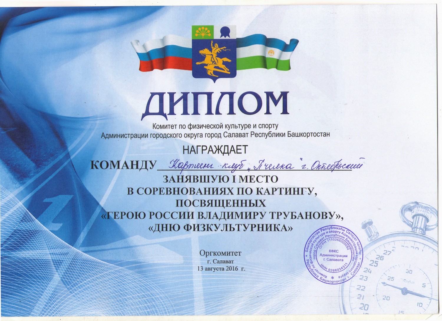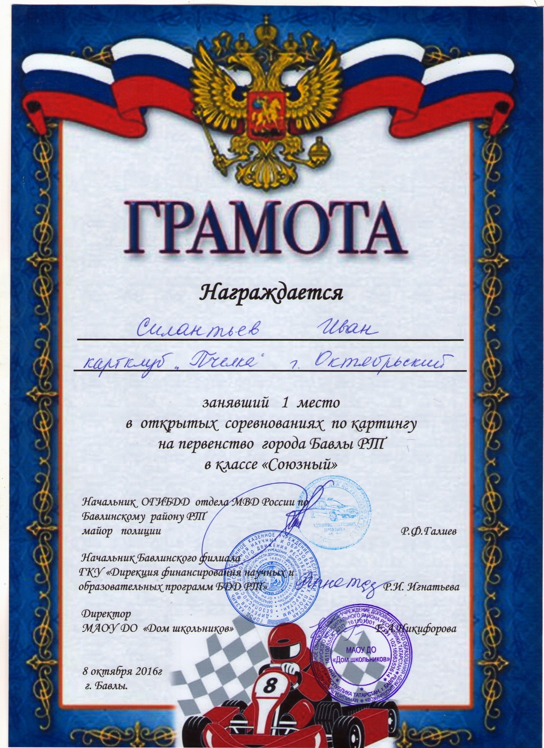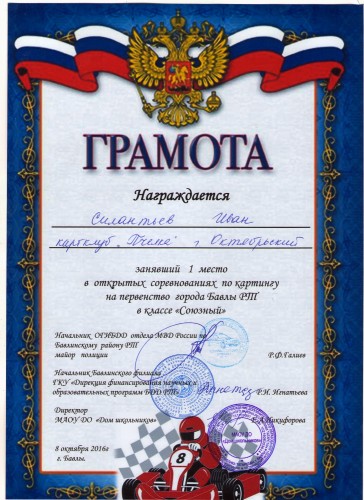 8 октября у наших соседей, в городе Бавлы, состоялись открытые соревнования по картингу на первенство города Бавлы Республики Татарстан. Эти соревнования закрывали летний сезон. На старт вышли юные спортсмены из семи команд. Город Октябрьский и в целом Республику Башкортостан на первенстве представляла команда картинг- клуба «Пчелка» Дворца детского и юношеского творчества. В Башкортостане аналогичные карт - клубы работают еще в десяти муниципальных образованиях. Соревнования 8 октября были организованы для нескольких классов картов. Командный результат, полученный «Пчелкой» - 4 место. Но покорилась нашим спортсменам и высшая ступень пьедестала. 1 место в классе «Союзный» завоевал Силантьев Иван. Тренирует Ивана Борис Борисович Черный –Ткач, руководитель картинг клуба «Пчелка». В архиве успешных летних выступлений картингистов текущего года есть и еще блестящие победы. 13 августа, в городе Салавате, в соревнованиях по картингу, посвященном Герою России Владимиру Трубанову и «Дню физкультурника» команда картинг - клуба «Пчелка» заняла 1 место. В личные достижения ребят также внесены две победы: в классе «Юниор» Сайгак Максим удостоен 2 места, а в классе «Национальный» 1 место завоевал Хисамов Наиль. Летний сезон завершен, впереди зимние соревнования. Пожелаем картингистам «Пчелки» побед и безаварийных стартов. | |